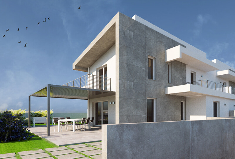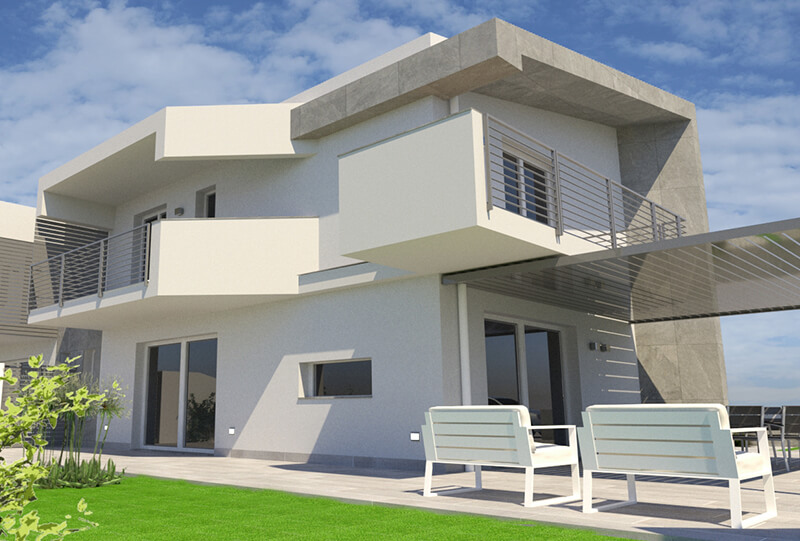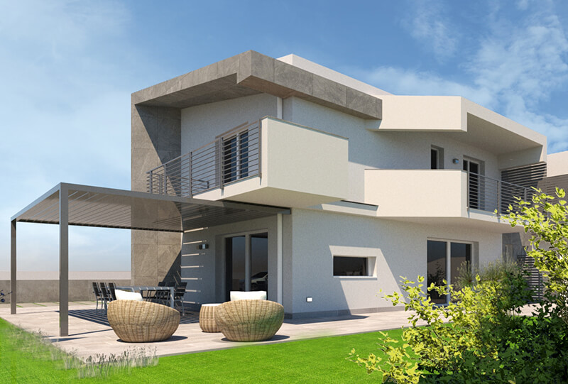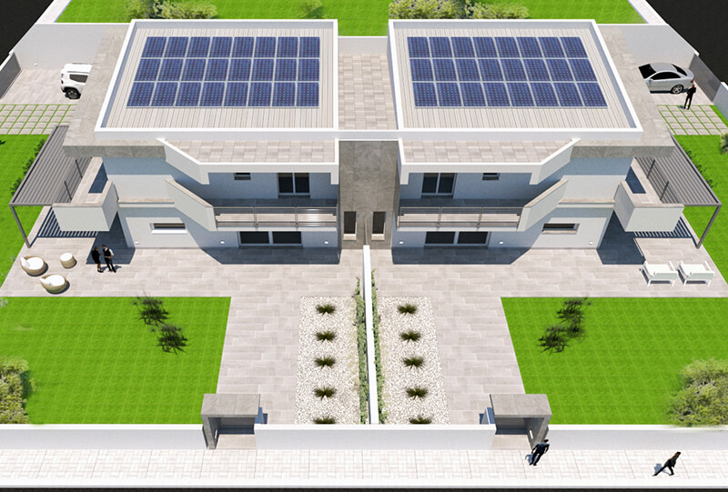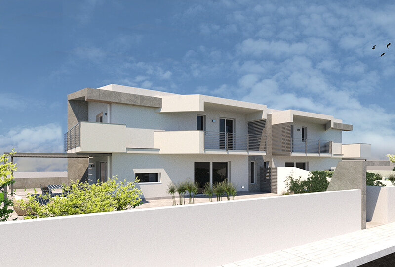 Proposta di progetto per la realizzazione di una villa bifamiliare sviluppata in un unico corpo di fabbrica. Le due residenze, dall’aspetto apparentemente identico, si differenziano internamente per assecondare le diverse esigenze della clientela. Volumi netti e decisi dall’aspetto semplice e moderno.
